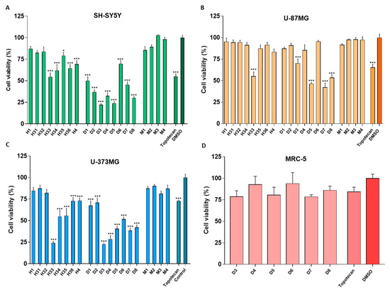 Effect of hexane (H1, H3.1–3.6, H4), dichloromethane (D1–D8) and methanol (M1–M4) sub-fractions (0.1 mg/mL) on cell viability after 24 h of treatment of the: (A) SH-SY5Y, (B) U-87MG and (C) U-373MG cell lines, and effect of dichloromethane (D3–D8) sub-fractions (0.1 mg/mL) on cell viability after 24 h of treatment of the (D) MRC-5 cell line. Topotecan (10 µM) was used as a positive control. Data represent the means ± s.e.m. (standard error of mean) from at least three independent experiments (n = 3). * p < 0.05 and *** p < 0.0001 compared to the respective control (cells treated with DMSO (vehicle) < 1%).