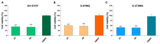 Effect of dichloromethane sub-fractions D7 and D8 (0.05 mg/mL) after 24 h of treatment on the cell viability of cell lines: (A) SH-SY5Y, (B) U-87MG and (C) U-373MG. Data represent the means ± s.e.m. (standard error of mean) from at least three independent experiments (n = 3). *** p < 0.0001 compared to the respective control (cells treated with DMSO (vehicle) < 0.5%).