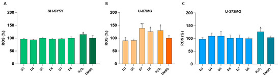 The effects of the dichloromethane sub-fractions D3–D8 (0.05 mg/mL) on ROS levels were evaluated in SH-SY5Y, U-87MG and U-373MG cells after 24 h of treatment. The D7 and D8 sub-fractions induced a noteworthy increase in ROS production, specifically in U-87MG cells (Figure 4A–C). Nevertheless, the control agent H2O2 significantly increased ROS levels across all cell lines.