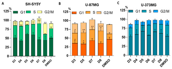Effect of the sub-fractions D3–D8 (0.05 mg/mL) on cell cycle progression after 24 h of treatment of cell lines: (A) SH-SY5Y, (B) U-87MG and (C) U-373MG. Data represent the means ± s.e.m. (standard error of mean) from at least three independent experiments (n = 3). * p < 0.05,** p < 0.01 and *** p < 0.0001 compared to the respective control (cells treated with DMSO (vehicle) < 0.5%).