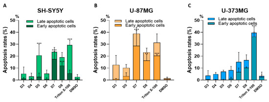 Effect of the sub-fractions D3–D8 (0.05 mg/mL) on cell death profile after 24 h of treatment of cell lines: (A) SH-SY5Y, (B) U-87MG and (C) U-373MG. Triton X-100, TX (1%) was used as a positive control. Data represent the means ± s.e.m. (standard error of mean) from at least three independent experiments (n = 3). ** p < 0.01 and *** p < 0.0001 compared to the respective control (cells treated with DMSO (vehicle) < 0.5%).
