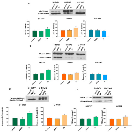 Effects of the sub-fraction D7 (0.05 mg/mL) on the expression of (A) p53 and (B) caspase-3 in SH-SY5Y, U-87MG and U-373MG cells lines and (C) caspase-8 and (D) ƴ-H2AX in SH-SY5Y and U-87MG cell lines after 24 h of treatment. DMSO: Cells treated with vehicle (<0.5%). Data represent the means ± s.e.m. (standard error of mean) from at least two independent experiments (n = 2). * p < 0.05 and *** p < 0.0001 compared to the control.