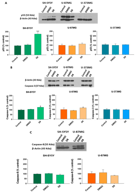 Effects of the sub-fraction D8 (0.05 mg/mL) on the expression of (A) p53 and (B) caspase-3 in SH-SY5Y, U-87MG and U-373MG cells lines and (C) caspase-8 in SH-SY5Y and U-87MG cell lines after 24 h of treatment. DMSO: Cells treated with vehicle (<0.5%). Data represent the means ± s.e.m. (standard error of mean) from at least two independent experiments (n = 2). * p < 0.05 and *** p < 0.0001 compared to the control.