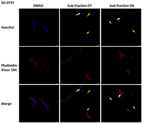 Effect of the sub-fractions D7 and D8 (0.05 mg/mL) on cell morphology after 24 h of treatment in SH-SY5Y cells using Hoescht (blue, chromatin status) and Phalloidin-iFluorTM 594 (red, cytoplasmatic traits). DMSO: Cells treated with vehicle (<0.5%). 20× magnification. Yellow arrows: apoptotic bodies; white arrow: alteration in nuclear morphology.