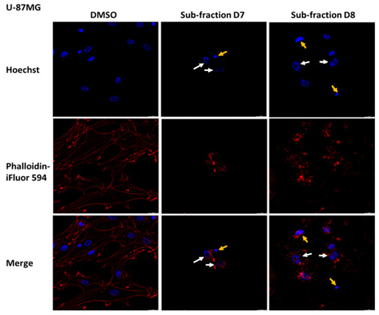 Effect of the sub-fractions D7 and D8 (0.05 mg/mL) on cell morphology after 24 h of treatment in U-87MG cells using Hoescht (blue, chromatin status) and Phalloidin-iFluorTM 594 (red, cytoplasmatic traits). DMSO: Cells treated with vehicle (<0.5%). 20× magnification. Yellow arrows: apoptotic bodies; white arrow: alteration in nuclear morphology.