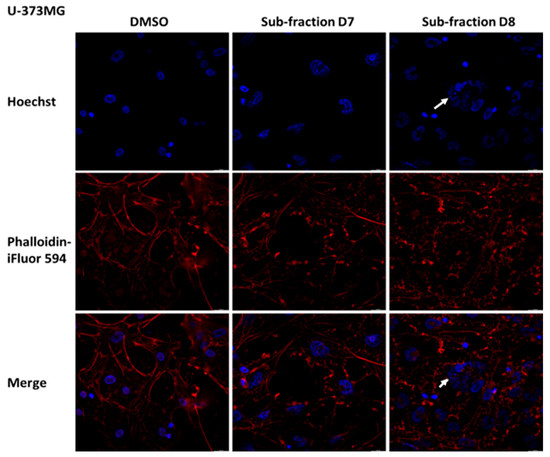 Effect of the sub-fractions D7 and D8 (0.05 mg/mL) on cell morphology after 24 h of treatment in U-373MG cells using Hoescht (blue, chromatin status) and Phalloidin-iFluorTM 594 (red, cytoplasmatic traits). DMSO: Cells treated with vehicle (<0.5%). 20× magnification. White arrow: alteration in nuclear morphology.