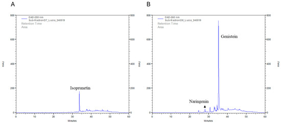 The HPLC-DAD chromatogram for sub-fraction D8 displayed one highly intense peak compared to the other peaks (Figure 12B). This peak was detected as genistein, with a concentration of 748.79 µg/mL. Additionally, naringenin was detected in this sub-fraction, with a concentration of 21.20 µg/mL.