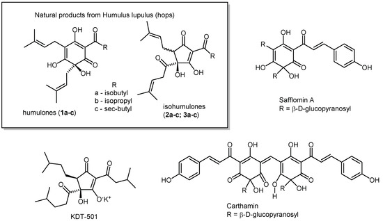 Substituted oxidized phloroglucinols have been identified in a number of plant sources, including humulones from hops (humulus lupulus), and safflomin A and carthamin from safflower (carthamustinctorius) [1,2,3,4,5,6]. (Figure 1) The harvested strobiles of hop plants contain from 2 to 15% humulones by dry weight [7]. Hops are one of four essential ingredients in beer brewing, along with malted grains, water and yeast. The humulones in hops are extracted into wort during beer brewing and isomerized to isohumulones [8,9,10,11]. It is the isohumulones that provide bitter flavor, as the humulones themselves have negligible bitterness, based on sensory perception [12,13]. By contrast, the products from safflower are used primarily as dyes. Safflomin A is a yellow pigment from the flowers of safflower. Carthamin has been used as a red dye in the textile industry and is also a food coloring agent known as Natural Red 26 [14,15]. Isomerization of oxidized phloroglucinols to five-member ring cyclopentenones is well known in the case of humulones to isohumulones [16] and has been observed in the synthesis of the derivatives safflomin and carthamin [17,18]. Investigations of these natural products and their derivatives are of great interest, due to the potential for biological activity [19]. For instance, isohumulones not only give bitter flavor, but also provide antibacterial protection in beer, improving long-term storage ability and product stability [20,21,22]. Isohumulones have also been shown to have potential for control of non-alcoholic fatty acid liver disease (NAFLD), type 2 diabetes and Alzheimer’s disease [23,24,25]. Hydrogenation of cis-isohumulone provided tetrahydro-cis-isohumulone KDT 501 (Kindex Therapeutics), which was evaluated in phase II clinical trials for treatment of insulin resistant, prediabetic patients, and is also being considered for control of polycystic ovarian syndrome and NAFLD [26,27,28,29].