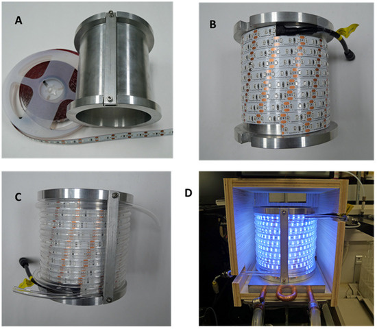 Construction of the continuous-flow photoreactors: (A) aluminum support; (B) strip LEDs attached to aluminum cylinder; (C) UV-transparent tubing held in place by aluminum bar; and (D) completed photoreactor with aluminum/copper cooling plate and safety cabinet (door open for photo).