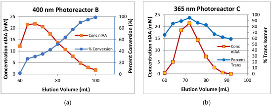 Reaction concentration of eluted fractions from photoreactors B and C: (a) elution profile of reaction concentration and percent conversion of a 5.0 mL injection of 0.1 M 1a to photoreactor B; reaction concentration based on combined 1a and product 2a; (b) elution profile of total concentration of nIAA (2a and 3a) and the percent trans isomer 2a from a 5.0 mL injection of 0.1 M 1a.