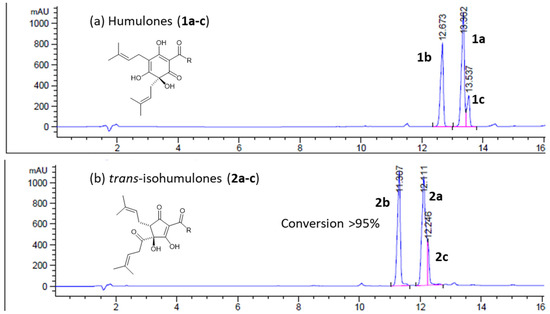 Chromatographic conditions listed in Section 3.1. HPLC analysis of homologs of (a) humulones 1a–c and (b) trans-isohumulones 2a–c. R group is isopropyl (2a), isobutyl (2b) and sec-butyl (2c). Final mixture ratio of trans-isohumulones 2b:2a:2c is 40:51:9.