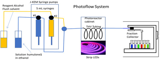 Since the seminal report from Booker-Milburn in 2005, Ref. [30], photoreactions coupled with flow chemistry have emerged as facile methods usable for the preparation of a wide range of compounds [31,32,33,34,35]. Light sources can be regarded as renewable, traceless reagents; as a consequence, most photochemical processes adhere to fundamental principles of “green chemistry”. Unless sunlight is being used, however, the light sources require energy input. Therefore, it is important to use the most efficient source possible and to minimize the distance between the light source and the substrate molecules. Most recent photochemical publications have employed reactions with photocatalysts [36]. However, it is also possible to facilitate molecular rearrangements and isomerization for molecules that absorb light in the appropriate region on the spectrum [37,38,39,40].