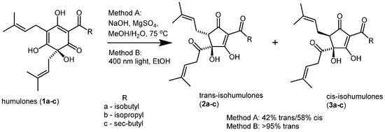 - Clarke, B.; Hildebrand, M. The isomerization of humulone; I. Isolation of photoisohumulone. J. Inst. Brew. 1965, 71, 26–36. [Google Scholar] [CrossRef]