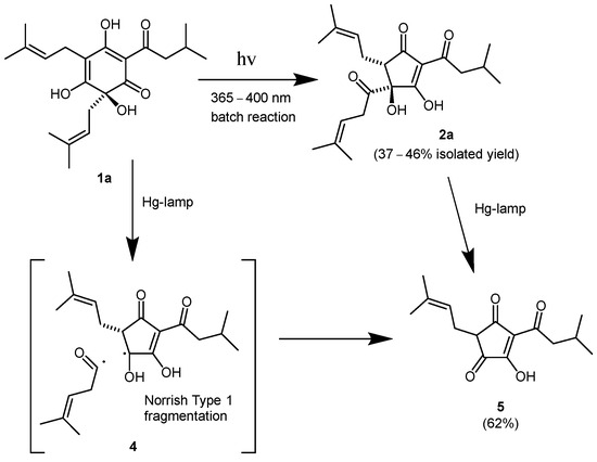 For our initial investigation of the photochemistry of humulone (1a), we used an unfiltered, water-cooled medium pressure Hg lamp in a batch reactor. A 0.17 M solution of 1a in methanol was exposed to the Hg lamp for 24 h, resulting in complete conversion to a new product. Chromatographic purification resulted in a moderate yield of cyclopentenone (5) (Scheme 2). HPLC analysis of the crude reaction mixture did not show any of the desired isohumulone (2a). Due to the wide spectrum emission of the mercury lamp, it is likely that the isohumulone (2a) is an intermediate which undergoes further reaction to afford the dehydrohumulinic acid (5). A Norrish type 1 fragmentation (4) gives rise to two free radicals via homolytic cleavage and loss of the hexenone side chain. Further loss of a hydrogen atom gives the observed dehydrohumulinic acid (5). The Norrish type 1 fragmentation is well known and is responsible for the undesirable light-struck flavors in beer [46,47].