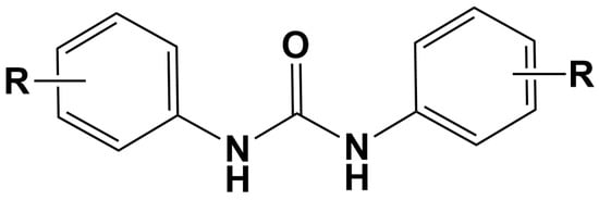 Among the numerous urea derivatives, diaryl ureas (DU) have emerged as a dominant subclass [3,4], particularly for their applications in oncology [5,6]. The general structure of diaryl ureas is depicted in Figure 1. Structurally, diaryl ureas are defined by the incorporation of two aromatic systems flanking the urea core. Different linkage and functional groups can be added to these aromatic rings to improve both the binding capacity and spatial reach inside the binding pockets of targeted proteins.