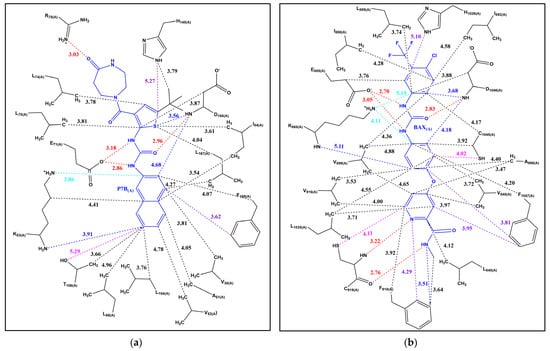 Nonbonded interactions. (a) A schematic interaction map between P7B and its interacting residues of mitogen-activated protein kinase 14 (PDB ID: 3P7B); (b) A schematic interaction map between BAX and its interacting residues of vascular endothelial growth factor receptor 2 (PDB ID: 3WZE). Dash lines indicate interatomic distance in Å for various intermolecular interactions (color code: hydrogen bonding in red, salt bridges in orange, π–π stacking interactions in purple, CH-π interactions in black, cation–π interactions in cyan, NH-π interactions in blue, OH-π interactions in pink, and SH-π interactions in magenta).