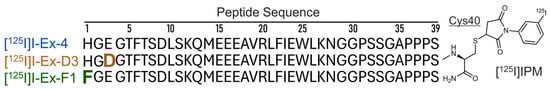 In this study, we synthesized Ex-4 derivatives with an additional Cys at the C-terminus (Ex-4-C40, Ex-D3-C40, and Ex-F1-C40) for radiolabeling. We evaluated their hypoglycemic activity and conducted Cys-specific 125I labeling studies using the Michael addition of maleimide and thiol ([125I]I-Ex-4, [125I]I-Ex-D3, and [125I]I-Ex-F1; Figure 1), employing the prosthetic agent N-(3-[125I]iodophenyl)maleimide ([125I]IPM) [33]. We evaluated the efficacy of single amino acid-substituted exendin-4 as a scaffold for GLP-1R imaging probes by examining the biodistribution of these labeled peptides in mice, especially focusing on Ex-D3 as a potentially superior parent peptide for GLP-1R imaging compared with Ex-4.
