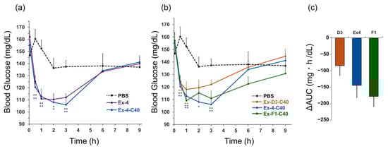 The temporal changes in blood glucose levels following the intravenous administration of Ex-4, Ex-4-C40, and phosphate-buffered saline (PBS) are illustrated in Figure 2a, while Figure 2b presents the blood glucose levels for Ex-D3-C40, Ex-4-C40, Ex-F1-C40, and PBS. Comprehensive blood glucose levels are provided in Table S3. Statistical analysis revealed no significant differences between Ex-4 and Ex-4-C40 at any time point (Figure 2a). The blood glucose levels after Ex-D3-C40 administration tended to be higher than those for other peptide groups from 1 h after injection onward. The blood glucose reduction (change in area under the curve, ΔAUC) over 9 h for Ex-D3-C40, Ex-4-C40, and Ex-F1-C40 was −84, −144, and −178 mg·h/dL, respectively, with Ex-D3-C40 demonstrating the smallest reduction (Figure 2c).
