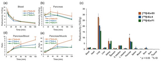 Biodistribution of [125I]I-Ex-D3, [125I]I-Ex-4, and [125I]I-Ex-F1 in healthy mice after intravenous administration. Radioactivity in the (a) blood and (b) pancreas. (c) Radioactivity distribution in internal organs at 120 min after administration. (d) Pancreas-to-blood and (e) pancreas-to-muscle radioactivity ratios. Data are expressed as mean ± standard deviation and were analyzed by one-way analysis of variance with Dunnett’s multiple comparison test. * p < 0.05, ** p < 0.01, compared with [125I]I-Ex-4.