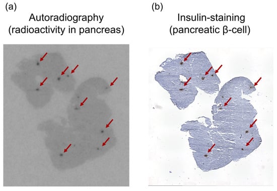 (a) Autoradiogram of [125I]I-Ex-D3 and (b) insulin immunohistochemical staining of representative pancreatic sections. Black spots indicate high radioactivity intensity in the autoradiogram, while brown-stained areas in the immunostaining image indicate insulin-positive regions. The red arrows in both images indicate the same position.