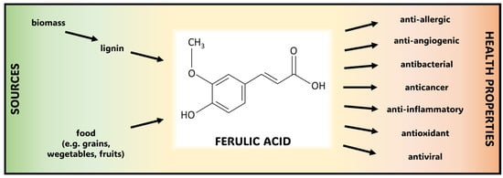 Ferulic acid (FA)—4-hydroxy-3-methoxycinnamic acid—is an organic chemical compound belonging to the phenolic acids subgroup of polyphenolic compounds. It was first isolated from the plant Ferula foetida. It is commonly found in fruits, vegetables, cereals, seeds, and herbs [1,2,3,4]. FA has various pharmacological activities: antioxidant, anti-inflammatory, antiangiogenic, antiallergic, antimicrobial and antiviral, neuroprotective, and anticancer [3,5,6,7,8]. Polyphenols encountered in plants and in particular in fruits exhibit anticancer properties. These compounds can be delivered into human body in the form of food, i.e., by the application of an adequate diet. Polyphenols and flavonoids are currently utilized in conceptual works concerning oncological therapies [9]. Interestingly, in order to obtain and produce polyphenols including FA, natural organic compounds can be successfully applied. For instance, biodegradation of lignocellulose or even lignin catalyzed by a carefully selected and extracted enzymes can be recommended [10,11]. In case of FA, a renewable source of organic carbon in the form of agriculture waste can be proposed. In particular, wastes received from processing of plant raw materials which are not further used in production of the first-generation biofuels can provide an efficient method in the nearest future. In work of Iram et al. [12], the method of a treatment of a plant waste in the production of first-generation bioethanol has been presented and described in detail. In this work [12], it was also shown that the same plant waste can be simultaneously used for production of second-generation ethanol, confirming that a single source can be utilized as an efficient source of two different products. In conclusion, a new approach in which lignin is processed into polyphenols with an application of biotechnological methods can be proposed and applied. A chemical structural formula of an FA compound with health properties and various sources is presented in Figure 1.