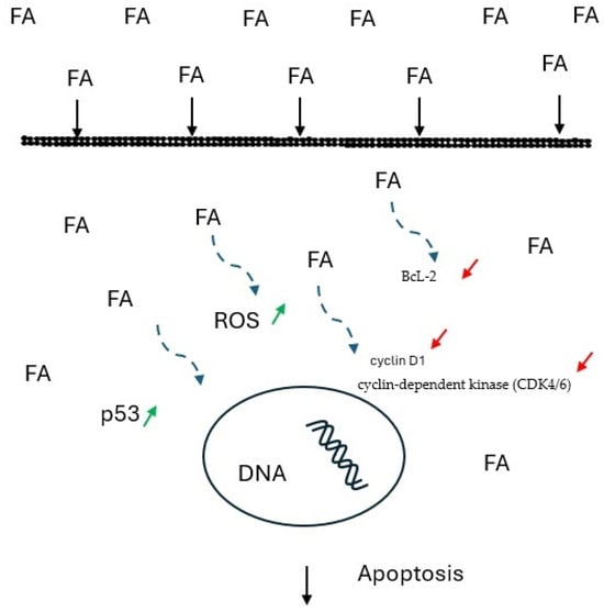 FA causes cell proliferation and apoptosis inhibition by increasing the expression of tumor suppressor p53, decreasing the expression of cyclin D1 and cyclin-dependent kinase (CDK4/6), and blocking the expression of the antiapoptotic protein BcL-2. FA affects cell mitochondrial apoptosis by inducing the production of intracellular reactive oxygen species (ROS), leading to cell DNA damage, genotoxic stress, and subsequent cell death. The suppression of PI3K/AKT/mTOR pathway signaling inhibits tumor migration, invasion, and angiogenesis. In addition, FA inhibits angiogenesis by decreasing the expression of VEGF mRNA and protein and by fibroblast growth factor-FGF1. Increased expression of the effector enzyme caspase 3 and inhibition of the nuclear transcription factor NF-kβ associated with antitumor apoptosis and inhibition of proliferation have also been described. The mechanism of FA action and its impact on cancer cells, as described above, is depicted in simple terms in Figure 2, based on exemplary mechanisms presented in several studies [6,15,18,21,22].
