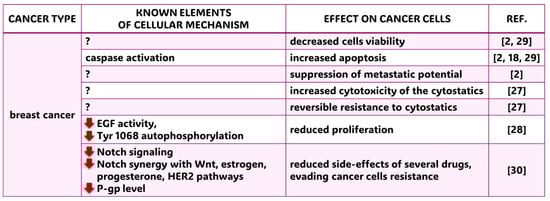 | increased cytotoxicity of the cytostatics reversible resistance to cytostatics | In vitro MDA-MB-231, MCF-7, MDA-MB-468, and BT-20 cell lines | [27] | |