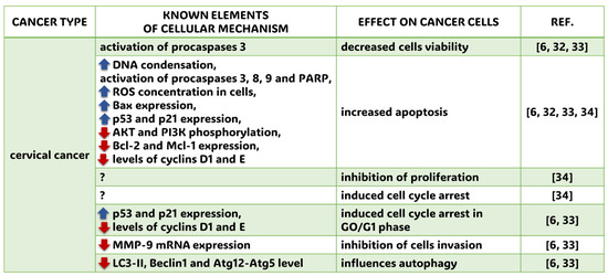 | reduced MMP-9 mRNA expression, decreased cancer cell viability, induced cell cycle arrest in GO/G1 phase, induced p53 and p21 cellular expression, decreased levels of cyclins D and E | In vitro HeLa and Caski cell lines | [6,33] | |
