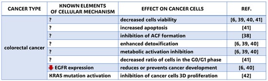 | Colorectal cancer | inhibition of ACF formation | In vivo F334 rats | [38] |