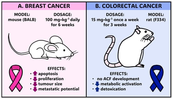 A summary of in vivo studies of ferulic acid application in cancer treatment—FA dosage and its resulting effects on cancer cells: (A) ferulic acid administration to mice for breast cancer treatment; (B) ferulic acid administration to rats for colorectal cancer treatment. Arrow heading up—enhanced effect; arrow heading down—diminished effect. The figures were prepared according to the information provided by (A) Zhang et al. (2016) [2] and (B) Kawabata et al. 2000 [38].