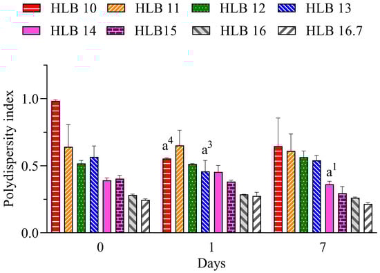 Polydispersity index of C. longa nano-emulsions. a1: p < 0.05, a3: p < 0.001, a4: p < 0.0001 in comparison to day 0. n = 3.