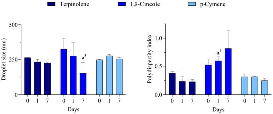 For all monoterpenes, the most transparent/translucent systems for all days were reached with polysorbate 80. A more transparent aspect was observed for terpinolene and p-cymene, while the 1,8-cineole was slightly more translucent. Due to the macroscopical evaluation, in which most of the systems at a wide range of HLB values were opaque, the DLS analysis was carried out only for the polysorbate 80-based systems, and the results are presented in Figure 3.