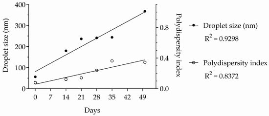 After the analysis of variance (ANOVA) described in Table 2, the data were subjected to a subsequent analysis using linear regression to test the linearity between the physicochemical properties and time. Both droplet size and the polydispersity index varied linearly with time (R2 = 0.9298 and 0.8372, respectively), as shown in Figure 4.