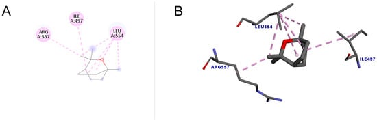Molecular docking of 1,8-cineole in the telomerase target. (A) Two-dimensional model; (B) three-dimensional model. Intermolecular interactions of the alkyl type are represented by the light pink color.
