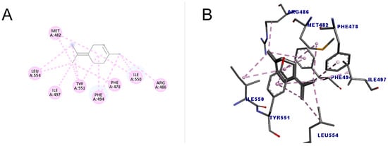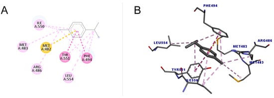 As shown in Figure 6, p-cymene performed better compared to 1,8-cineole both in the number of interactions and the score value (48.76). All interactions were hydrophobic, with one pi–sulfur, one pi–pi stacked, one pi–pi t-shaped, four alkyl, and four pi–alkyl, totaling eleven interactions. The pi–sulfur interaction occurred between the residue Met482 with the aromatic group of p-cymene, of the order sp2. The pi–pi stacked connection is a type of interaction that occurs between aromatic groups, containing a pi orbital, which was detected between the Phe494 residue and the ligand. As for the pi–pi T-shaped type, which occurred with Tyr551, it is an interaction that also occurs in cyclic systems with double bonds, which form a specific angle for each ring in a spatial configuration that has the T format [49].