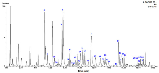 The LC-MS fingerprint of RGWRT in the negative mode and the serial numbers of peaks were consistent with the isolated compounds. The retention times of isolated compounds ranged from 5 to 19 min.