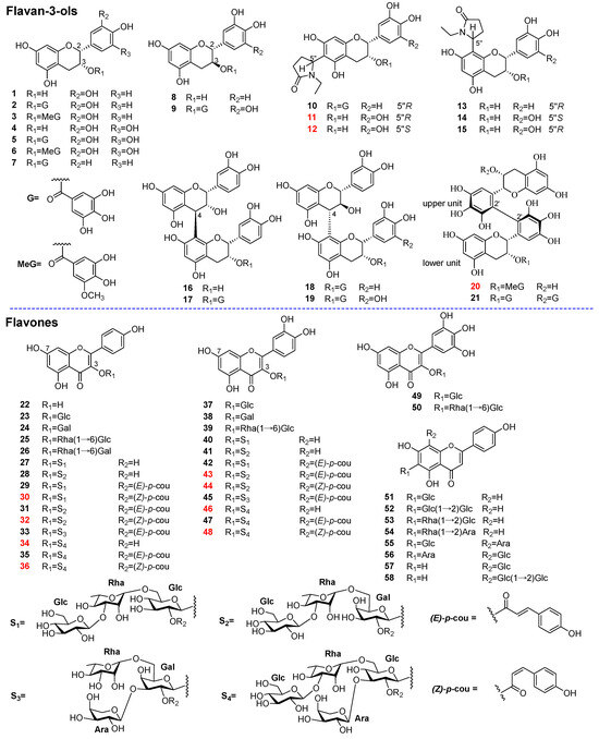 - Meng, X.H.; Liu, C.; Fan, R.; Zhu, L.F.; Yang, S.X.; Zhu, H.T.; Wang, D.; Yang, C.R.; Zhang, Y.J. Antioxidative flavan-3-ol dimers from the leaves of Camellia fangchengensis. J. Agric. Food Chem. 2018, 66, 247–254. [Google Scholar] [CrossRef]