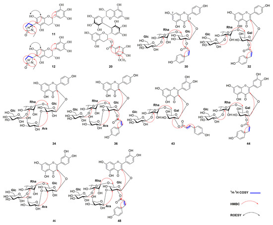 Compound 43 was presented as yellow amorphous powder with a molecular formula of C42H46O23 by HR-ESI-MS ion at m/z 917.2331 [M − H]− (calcd for C42H45O23, 917.2352). The 1H NMR spectrum indicated the typical quercetin unit signals at δH 7.46 (1H, d, J = 2.2 Hz, H-2′), δH 7.63 (1H, dd, J = 8.5, 2.3 Hz, H-6′), δH 6.79 (1H, m, H-5′), δH 6.29 (1H, br s, H-8) and δH 6.11 (1H, br s, H-6), and E-p-coumaroyl group with protons at δH 7.56 (1H, d, J = 15.9 Hz, H-Cou-7), δH 7.52 (2H, d, J = 8.6 Hz, H-Cou-2, H-Cou-6), δH 6.79 (2H, d, J = 8.4 Hz, H-Cou-3, H-Cou-5), and δH 6.38 (1H, d, J = 15.9 Hz, H-Cou-8) [72]. Furthermore, three anomeric proton signals of sugar moieties were observed at δH 5.59 (1H, d, J = 8.0 Hz, H-1″), δH 4.49 (1H, br s, H-1‴), and δH 4.32 (1H, d, J = 7.7 Hz, H-1′′′′) (Table 2). 2D NMR and acid hydrolysis experiments were performed to determine the sugar unit and the glycosidic linkage of 43, which suggested the existence of a β-D-galactopyranosyl, an α-L-rhamnopyranosyl, and β-D-glucopyranosyl moieties. The attachments of sugar chains and E-p-coumaroyl group were determined by the HMBC correlations of δH 5.59 (H-1″, Gal) to δC 132.8 (C-3), δH 4.49 (H-1‴, Rha) to δC 64.9 (C-6″, Gal), δH 4.32 (H-1′′′′, Glc) to δC 81.7 (C-3‴, Rha) and δH 5.22 (H-2″, Gal) to δC 166.0 (C=O of E-p-coumaroyl group) [61]. Accordingly, compound 43 was identified as quercetin-3-O-[2″-O-(E)-p-coumaroyl] [β-D-glucopyranosyl-(1→3)-α-L-rhamnopyranosyl-(1→6)]-β-D-galcopyranoside.