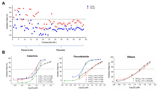 Inhibition rate (%) of 58 tea polyphenols against SARS-CoV-2 3CLpro (A), and representative inhibition curves for catechin derivatives (compounds 4, 5, 6, and 9), flavoalkaloid derivatives (compounds 11, 12, 14, and 15) and other types of polyphenols (compounds 20 and 32) against SARS-CoV-2 3CLpro (B).