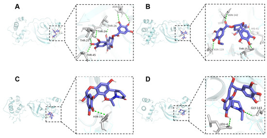The docking mode and hydrogen bond interactions between the selected bioactive compounds and 3CLpro. (A): compound 5, (B): compound 6, (C): compound 11, (D): compound 15.