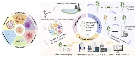 Multi-omics-integrated technologies are currently being progressively applied to the study of endophytic fungal diversity and the mechanisms of interaction between endophytic fungi and medicinal plants, building on the foundation of classic omics technologies. By utilizing SCIENCE DIRECT, WEB OF SCIENCE, and PUBMED, search for literature from the past five years in 2024 using keywords such as “endophytic fungi”, “medicinal plants”, “interactions”, “growth promotion”, “increased antagonism”, “secondary metabolites”, and “omics”, and further screen the literature for use in this article. This review mainly discusses the diversity of endophytic fungi and the interaction mechanism between endophytic fungi and host plants from the above aspects and the application of omics technology in the study of the interaction mechanism between endophytic fungi and medicinal plants, as shown in Figure 1.