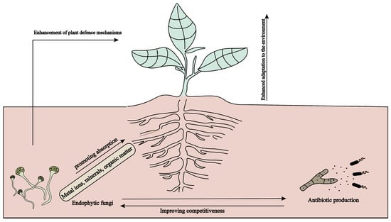 Plants withstand detrimental environmental challenges throughout their development, encompassing biotic and abiotic stressors. Biotic stress mostly pertains to harm inflicted on plants by diseases, insects, and other creatures. Abiotic stress predominantly arises from drought, salinity, alkalinity, and heavy metals, resulting in nutritional depletion and metabolic dysfunction in host plants. Endophytic fungus can augment the resilience of host plants to biotic and abiotic conditions, particularly excelling in drought, salinity, alkalinity, and pest resistance [11], hence enhancing the survival capacity of medicinal plants. The ways in which endophytic fungi improve the stress resistance of medicinal plants can be classified into three categories (Figure 4): (1) through the facilitation of the host plant’s uptake of metal ions, minerals, and organic compounds, which in turn boosts the host plant’s resilience to environmental stress; (2) by synthesizing antibiotics or other secondary metabolites to bolster their own competitive edge; (3) by triggering or amplifying the host plant’s defense responses to fend off pathogen attacks.