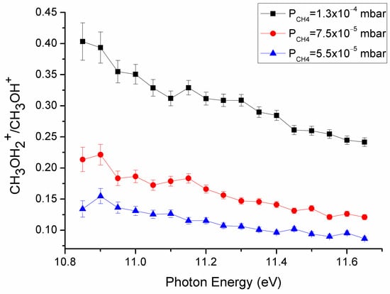 where k(hν) is the rate coefficient depending on the energy hν used to ionize the methanol molecule; R(hν) is the experimental product/reagent mass ratio reported in Figure 2; NCH4 is the number density of the methane, which depends on its pressure (whose error is estimated as 20%); τR is the characteristic time interval, which is assumed to depend on the nature of the ionized molecule as well as on the experimental setup, with a value of (1.7 ± 0.6) × 10−4 s determined from a previous work [44]. The experimental rate coefficients derived from Equation (1) are reported in Figure 5 for various CH4 pressures.