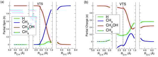 Along the first coordinate (RC-H), spin remained localized on methanol (red line), while methane exhibited a small charge around 0.04 e, represented by a mix of green and blue lines. In the second coordinate (RO-H), both charge and spin remained stable up to the VTS structure, where the distance between methane’s hydrogen and methanol’s oxygen measured 2.13 Å. As the hydrogen from methane (green line) approached the oxygen in methanol, the spin of CH3OH+ declined rapidly, shifting to the forming CH3 group up to (blue line) 1.0 ħ in the right panel of Figure 4a, where the products were formed. Concurrently, the charge decreased in CH3OH+ and increased in both CH3 and the hydrogen detaching from methane (green line) until the O-H distance reached 1.17 Å, after which the charge stabilized in CH3OH+, increased in H, and declined in CH3 (left panel, blue line in Figure 4b). This picture clearly shows that charge and spin were redistributed after the formation of the VTS, that is, the bottleneck of the reaction.