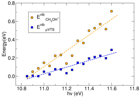 The and at hν > EI(CH3OH) were determined by fitting Equation (2) with the experimental rate coefficient at each hν. The results are reported in Figure 7, which shows that has almost a linear dependence on ionization energy. At each hν the methanol cation always took more than 50% of the excitation energy (Eexc = hν − EI), and at hν = 11.6 eV it reached about 0.7 eV, i.e., about 90% of the Eexc, while the ejected electron took only 10% of this excitation energy. This behavior is consistent with the relatively floppy nature of the methanol cation, with many vibrational degrees of freedom able to absorb Eexc above the ionization threshold. By contrast, had a slower dependence on hν, indicating that only a fraction of the vibrational energy of CH3OH+ was stored in the vibrational levels of the µVTS complex, whereas the greater part of the vibrational energy of the methanol cation went into the reactive coordinate. Overall, the behavior of both and was strongly non-thermal, indicating that the reaction proceeds with energy fluxes driven by dynamical factors rather than thermal statistical mechanisms.