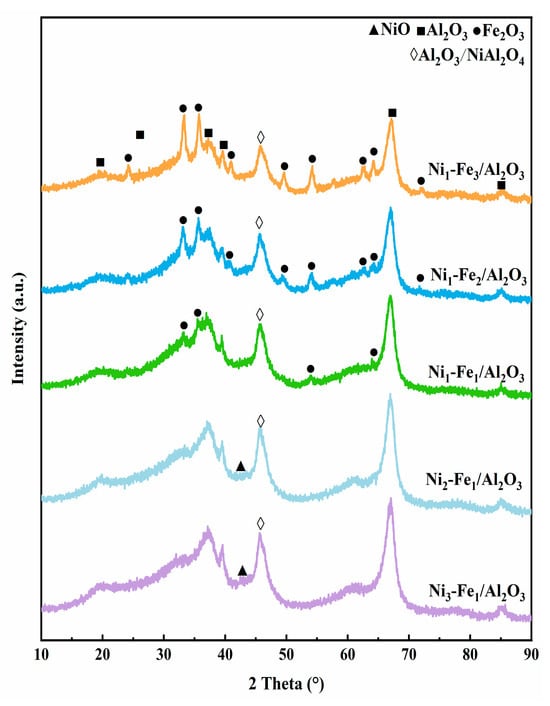 The crystalline compositions of as-prepared Nix-Fey/Al2O3 catalysts were identified by X-ray diffraction (XRD), with the resulting patterns presented in Figure 1. Distinct diffraction peaks at 37.5°, 39.3°, and 66.6° are observed in several catalyst samples, corresponding to the characteristic peaks of the γ-Al2O3 support (PDF#50-0741). For the Ni1-Fe3/Al2O3 catalyst, sharp peaks associated with the Fe2O3 phase (PDF#33-0664) are present. As the Ni content increases, the characteristic peaks of metallic Ni exhibited a slight shift towards lower 2θ values, while no features corresponding to Fe2O3 were observed. This observation is likely due to the formation of NiAl2O4 species [25] and the high dispersion of the Fe phase. Notably, FeAl2O4 was not detected in the catalysts, indicating that the interaction between nickel (Ni) and Al2O3 is stronger than that between iron (Fe) and Al2O3 [26]. Among the various Ni/Fe ratio catalysts, the Ni3-Fe1/Al2O3 catalyst exhibits a slightly enhanced full width at half maximum of the diffraction lines, indicative of a higher degree of crystallinity or slightly larger Al2O3 crystallite size [27].