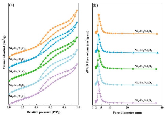 The pore structure of Nix-Fey/Al2O3 catalysts significantly influences the catalytic tar reforming performance. The porosity of the as-prepared catalyst was characterized using nitrogen adsorption measurements. As illustrated in Figure 2a, all five Nix-Fey/Al2O3 catalysts exhibit type IV isotherms with H3 hysteresis loops, according to the IUPAC classification, irrespective of the Ni/Fe ratio [27]. This suggests that varying the Fe content does not significantly alter the mesoporous structure of the catalysts. The formation of mesoporous structures is typically governed by the synthesis conditions of the support material, such as the calcination temperature. In this case, Ni and Fe metal nanoparticles are primarily loaded onto the surface of the support or within the pores as active components, rather than directly contributing to the construction of the mesoporous framework. As a result, altering the Fe content mainly impacts the catalytic activity without disrupting the integrity of the original mesoporous structure. The specific surface area, total pore volume, and average pore size of the catalysts are summarized in Table 1. Among them, the Ni3-Fe1/Al2O3 catalyst exhibits the largest specific surface area and pore volume, attributed to the high dispersion of active metal nanoparticles on the support surface [28], which preserves the pore structure. The pore size distribution curve (Figure 2b) shows a narrow pore size distribution range (2–5 nm), further confirming the mesoporous structure of all catalysts [29]. The mesoporous structure provides ideal sites for accommodating macromolecular tar during the reforming reaction and offers numerous available channels to facilitate the diffusion and transport of tar and CO2 [30]. The transport path of reactants is not confined solely to the pores; however, the presence of pores enhances the likelihood of reactants interacting with the active sites, thereby improving the selectivity of the reaction.