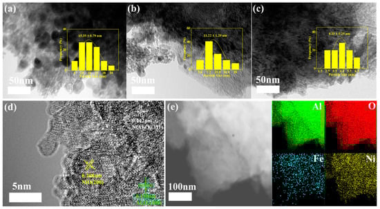 The surface morphology and metal dispersion of the Nix-Fey/Al2O3 catalysts were further analyzed using transmission electron microscopy (TEM). As shown in Figure 3a–c, the average particle sizes of the Ni1-Fe3/Al2O3, Ni1-Fe1/Al2O3, and Ni3-Fe1/Al2O3 catalysts were 15.4 nm, 11.2 nm, and 4.3 nm, respectively. Notably, the Ni3-Fe1/Al2O3 catalysts exhibit the best metal dispersion, indicating that the appropriate iron doping can significantly promote the dispersion and reduce the nanoparticle sizes. Previous studies have highlighted that catalysts containing small-sized nickel nanoparticles exhibit superior tar conversion activity and improved resistance to carbon deposition [30]. In order to further analyze the crystal structure of Ni3-Fe1/Al2O3, we use fast Fourier transform and fast inverse Fourier transform on the selected region of the HRTEM image to obtain the information of its lattice fringe space. The HR-TEM images in Figure 3d show clear lattice streaks of metal nanoparticles. The interplanar spacings of 0.208 nm and 0.242 nm correspond to the NiO (200) and NiAl2O4 (311) crystal planes, respectively. Additionally, Al2O3 (400) crystal planes were also identified, which supports the XRD results. The findings indicate that the strategic addition of Fe helps to prevent the sintering of active metal particles and further reduces the average particle size. Furthermore, high-angle annular dark-field scanning transmission electron microscopy (HAADF-STEM) image and the corresponding energy-dispersive X-ray (EDX) elemental mapping of the Ni3-Fe1/Al2O3 catalyst (Figure 3e) reveal the uniform distribution of Ni and Fe across the Al2O3 support. These results provide crucial insights into the catalyst’s structural characteristics and its potential for efficient catalytic performance.