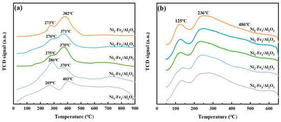 Hydrogen programmed reduction (H2-TPR) was conducted to investigate the reducibility of metal oxides on the Ni-Fe/Al2O3 catalyst surface (Figure 4a). All samples exhibited three distinct H2 consumption peaks within the 200–900 °C temperature range. Specifically, the peaks around 269~286 °C are attributed to the reduction of Fe2O3 to Fe3O4 on the catalyst surface, as well as the surface reduction of nickel monoxide, which is likely influenced by its weak interaction with the Al2O3 support. The peaks around 370~403 °C are associated with the reduction of Fe2O3 to Fe3O4 within the catalyst lattice [31,32]. For the Ni3-Fe1/Al2O3 catalyst, a minor peak at 269 °C, a principal peak at 403 °C, and a broad peak centered around 750 °C was noted. The peak observed at 750 °C is associated with the reduction of NiAl2O4 to metallic Ni [33,34]. These observations are in strong agreement with the X-ray diffraction (XRD) analysis, confirming the presence of the corresponding phases. Among all the catalysts evaluated, Ni3-Fe1/Al2O3 exhibits the highest reduction temperature at 403 °C. This phenomenon can be attributed to the particularly strong metal–support interaction, which facilitates a high degree of metal dispersion on the Al2O3 support surface. The enhanced reducibility of the Ni3-Fe1/Al2O3 catalyst, as demonstrated by the H2-TPR results, is expected to generate a greater number of active sites, thus enhancing its catalytic activity.