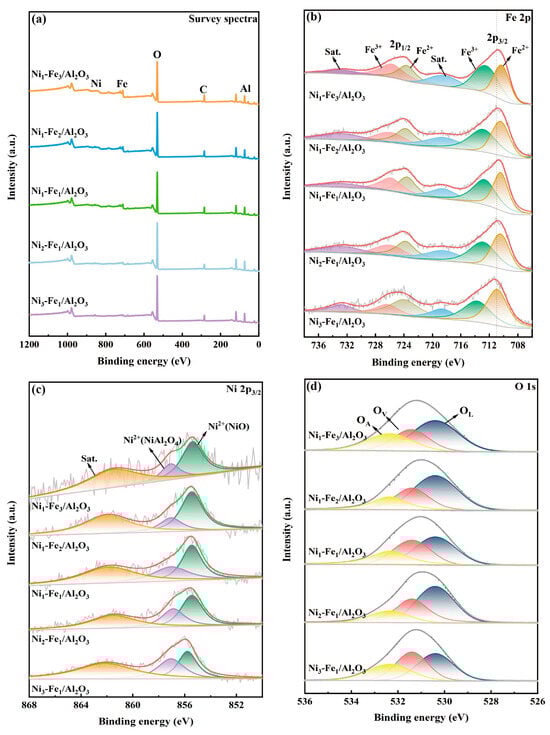 The electronic states and chemical composition of the elements on the surface of the Nix-Fey/Al2O3 catalysts were characterized using X-ray photoelectron spectroscopy (XPS). Figure 5a presents the survey spectra of Nix-Fey/Al2O3 catalysts, revealing that the chemical composition of the Nix-Fey/Al2O3 catalysts primarily consists of Ni, Fe, Al, and O. This observation is consistent with the results obtained from EDX analysis. In Figure 5b, the Fe 2p spectra can be deconvoluted into six peaks. The peaks at approximately 710.3 eV and 723.9 eV are attributed to Fe2+, while those at approximately 712.5 eV and 727.1 eV are attributed to Fe3+ [39,40]. The remaining two peaks are identified as satellite peaks [41]. As the Ni content increases, the binding energy of Fe 2p in Nix-Fey/Al2O3 shifts to a lower value. This observation confirms the presence of a strong electronic interaction between Ni and Fe, resulting in the presence of different Ni contents affecting the chemical environment of metal Fe. Figure 5c illustrates the high-resolution XPS spectrum of Ni 2p3/2, which consists of peaks corresponding to Ni2+ (855.5 eV) and NiAl2O4 (856.9 eV), attributed to air exposure, along with satellite peaks at 862.0 eV [33,42]. In the Ni 2p3/2 spectra of the catalysts, the relative abundance of Ni2+ species increases significantly with higher Fe content, resulting in a more pronounced presence compared to Ni3+. This trend is accompanied by a reduction in binding energy, indicating a stronger interaction between Ni and Fe with increasing Fe content.